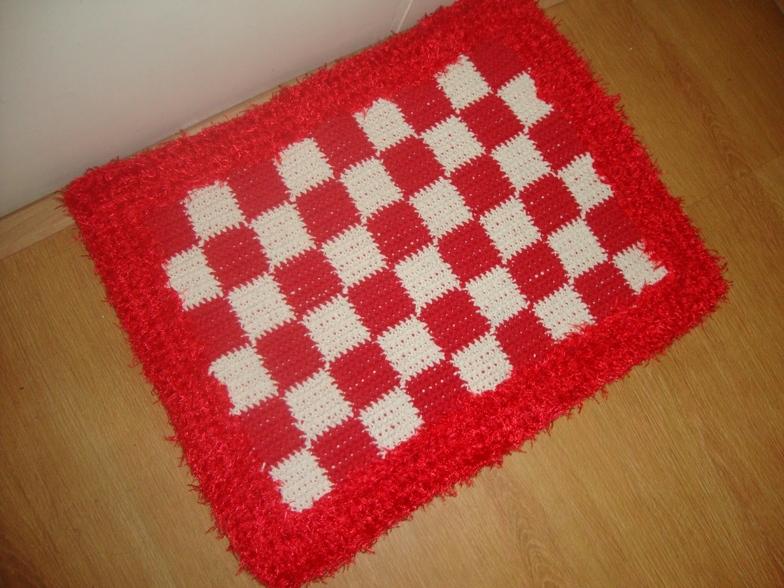 Usei os fios da Joka Novelos (cor branca) e Barbantes São Francisco (vermelhos). Eu modifiquei um pouco o modelo ensinado: fiz apenas em duas cores, no vídeo era três e diminuí também no tamanho (a quantidade de carreiras, ou melhor de quadrinhos, pois no original são onze e eu fiz seis), pois queria um modelo para porta...Ah e e aumentei uma carreira a mais do fio peludinho na finalização...
