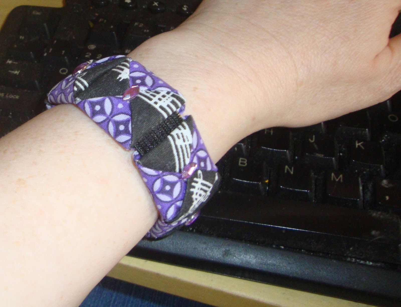 Você precisará cortar os quadrados de tecido e impermeabilizá-los com a cola diluída em água. Deixar secar, dobrar e depois montar o seu bracelete.
