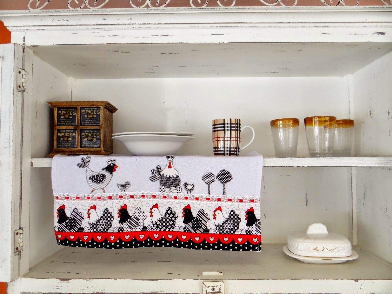Para o Patch aplique, recorte as figuras dos barrados deixando uma margem de 0,75 depois aplique o termocolante no avesso da figura recortada e passe o ferro para aderir um ao outro, então retire a película e cole a figura no pano de prato, mais uma vez passe o ferro por 5 segundos sobre a figura para aderir ao pano de prato, faça o ponto caseado e passe a termolina para não desfiar, deixe secar, ou acelere o processo com um secador de cabelo.